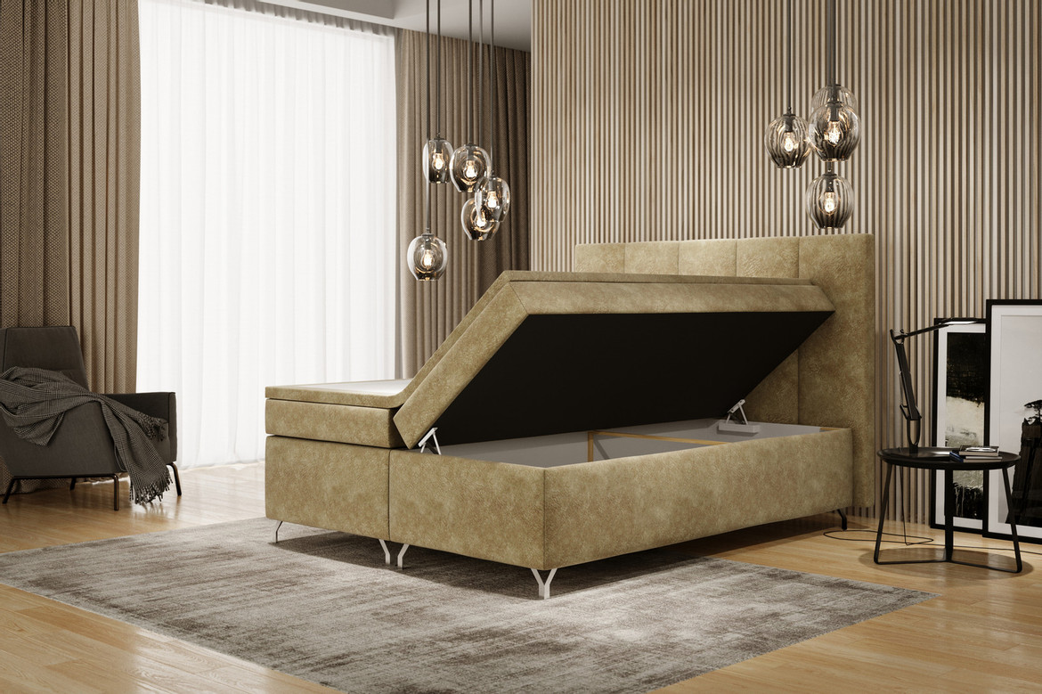 Luxusná dvojlôžková čalúnená posteľ s vysokým čelom a úložným priestorom.