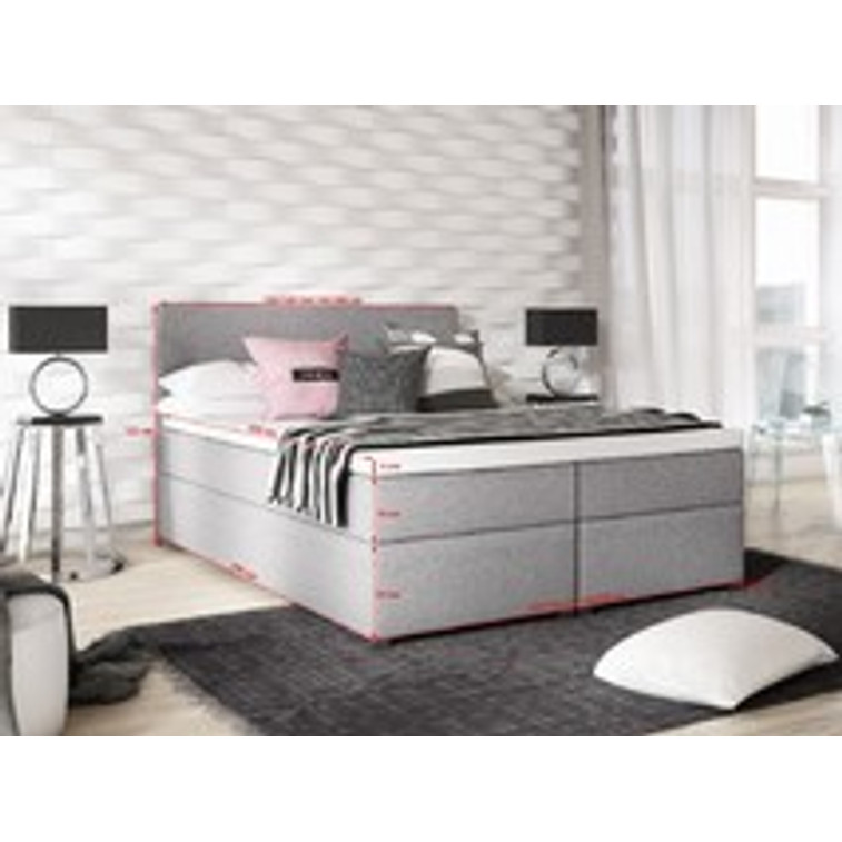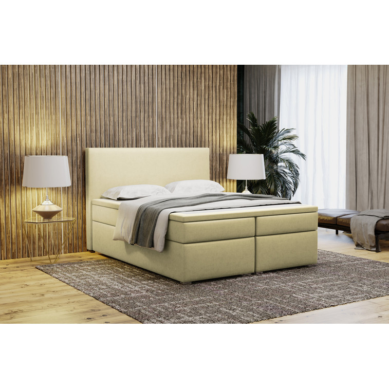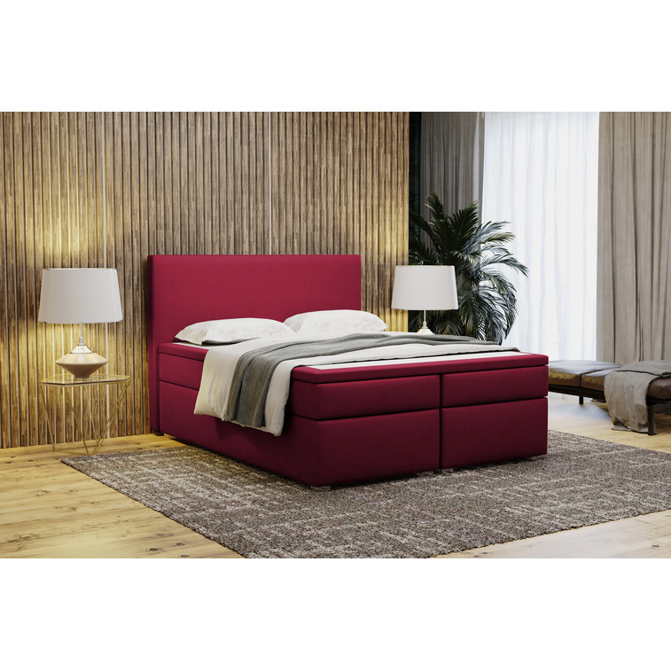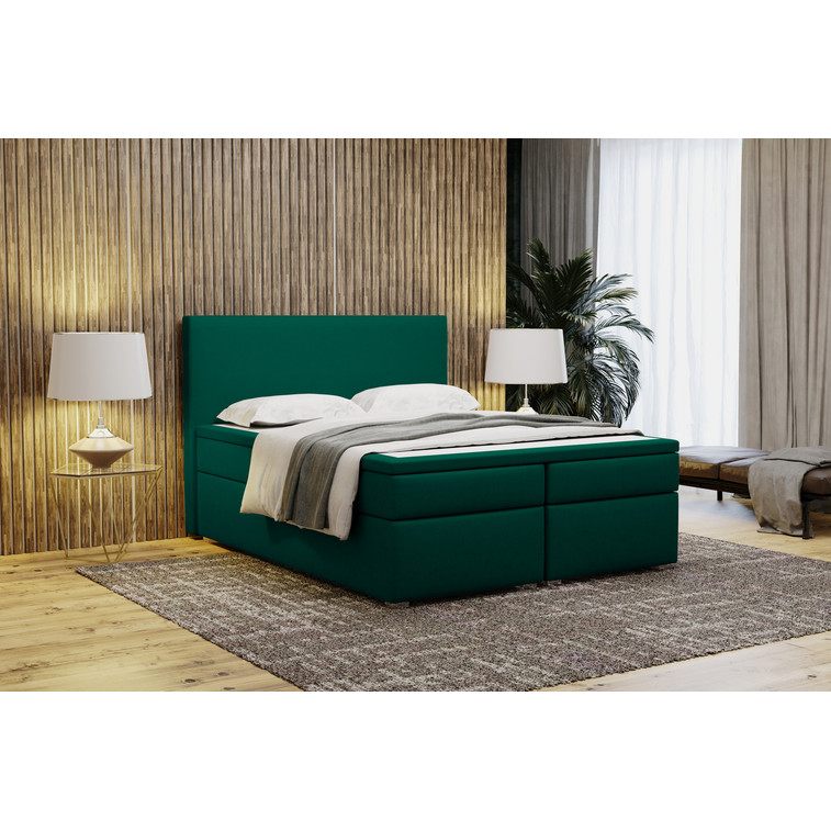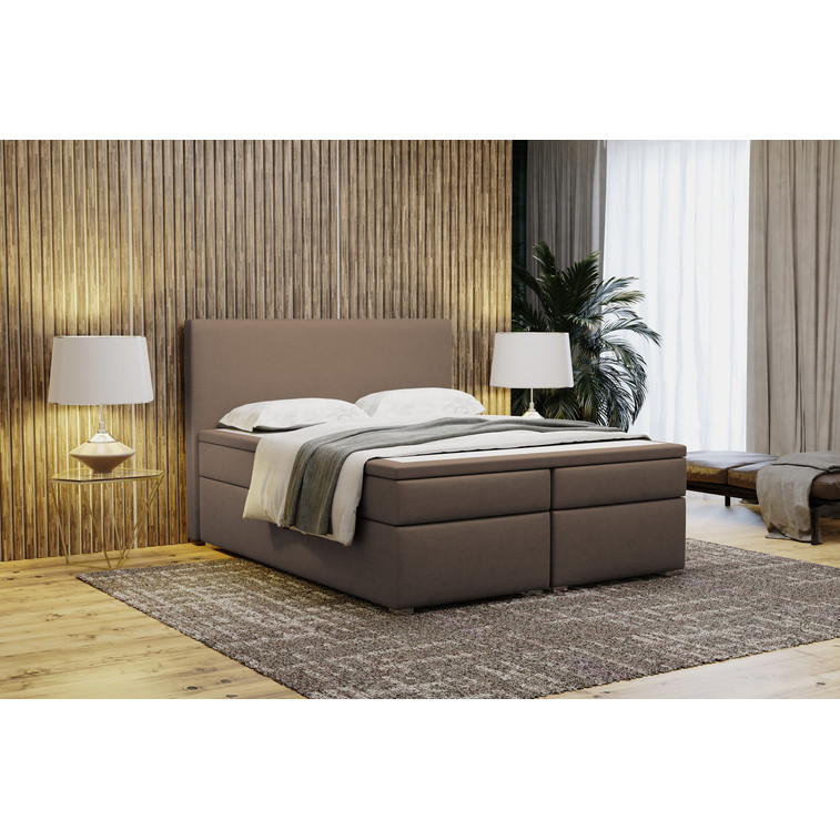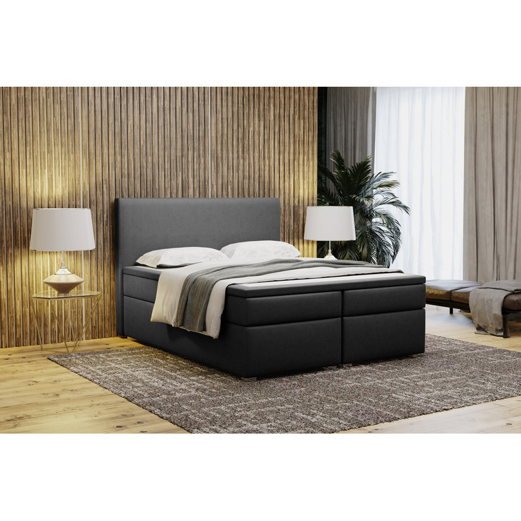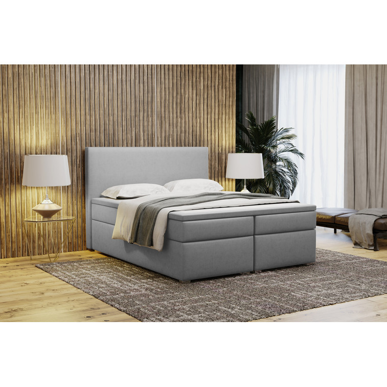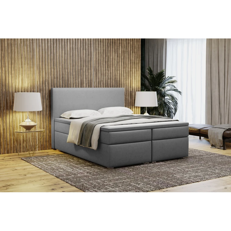 Luxusná dvojlôžková čalúnená posteľ s vysokým čelom.