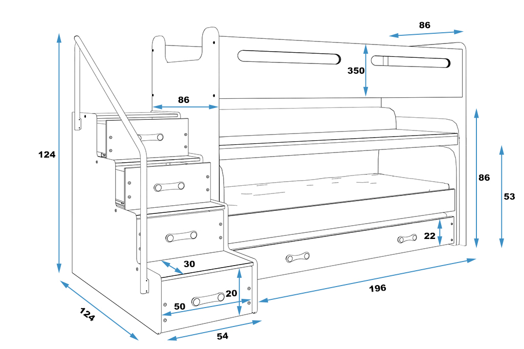 Orientáciu schodíkov s úložným priestorom si zvolíte sami podľa potreby. K posteli dodávame zadarmo lamelový rošt FLEX a PUR penový matrac so snímateľným antialergickým poťahom.