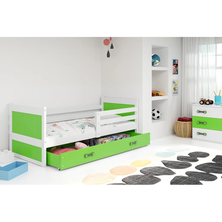 Lacná detská posteľ s matracom a roštom vrátane úložného priestoru v podobe zásuvky  dopraje vášmu dieťaťu pokojný spánok. Vďaka ochrannej zábrane bude v bezpečí a aj vy budete môcť konečne bez strachu usínať. Jednoducho poskytnete Vášmu dieťaťu do izbičky dizajnovo zaujímavú, funkčnú posteľ, na ktorej si bude cez deň hrať a večer snívať bez toho, aby táto investícia výrazne prevetrala váš bankový účet. Všetky farby krásne rozžiaria akúkoľvek izbičku a vám vďaka priestrannému úložnému priestoru ubudne starosť, kam s hračkami nebo navlečenými lôžkovinami.