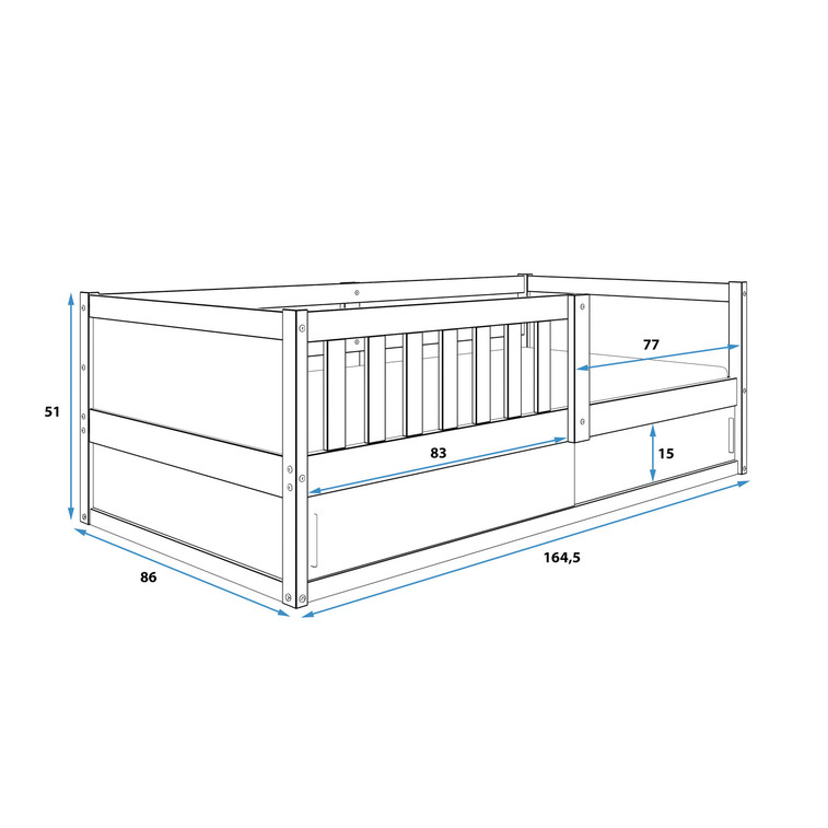 Posteľ obsahuje ochrannú zábranu. Vďaka praktickému úložnému priestoru vyriešite problémy s uschovaním všetkých malých nevyhnutností. S ohľadom na deti je všetok sortiment vyrobený ekologicky. Je teda vylúčené pri kontakte dieťaťa s nábytkom požitie toxických alebo zdraviu škodlivých látok.