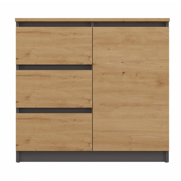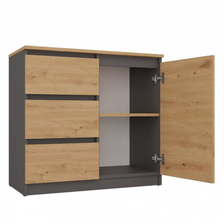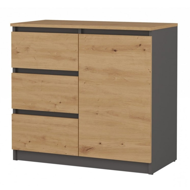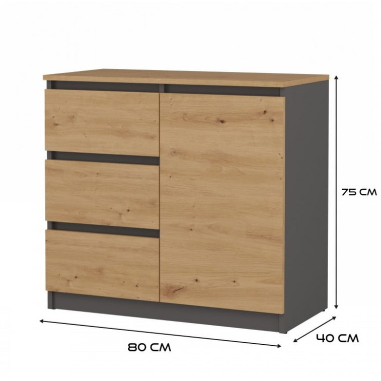 Moderná komoda 1D3S je funkčný kus nábytku, ktorý ozdobí interiér vašej spálne, obývacej izby alebo detskej izby. Univerzálny vzhľad splní očakávania všetkých, ktorí oceňujú spojenie jednoduchosti a elegancie. Vnútro komody sa skladá z políc a zásuviek, ktoré vám pomôžu veci usporiadať.