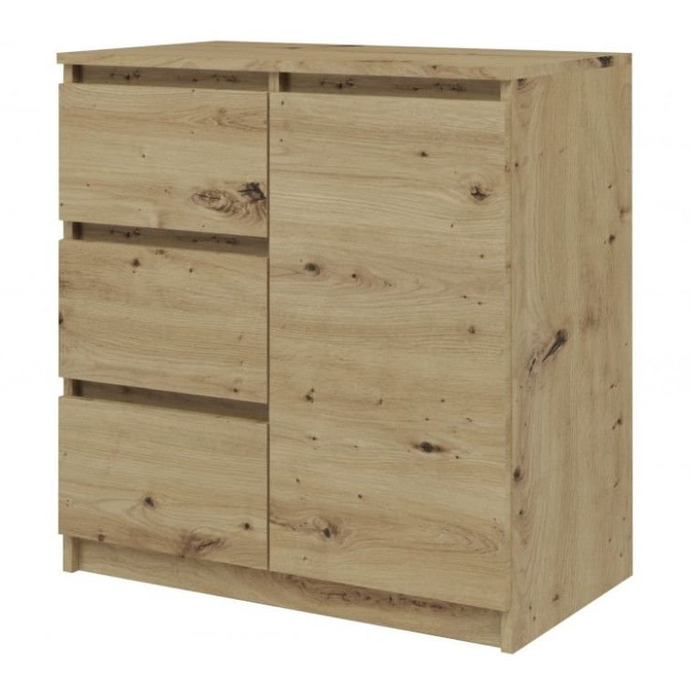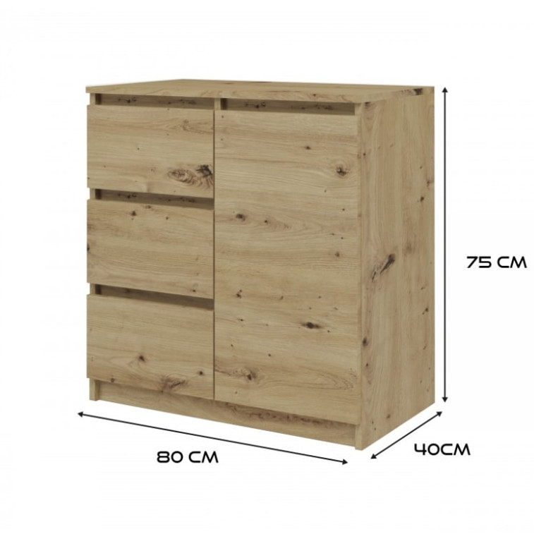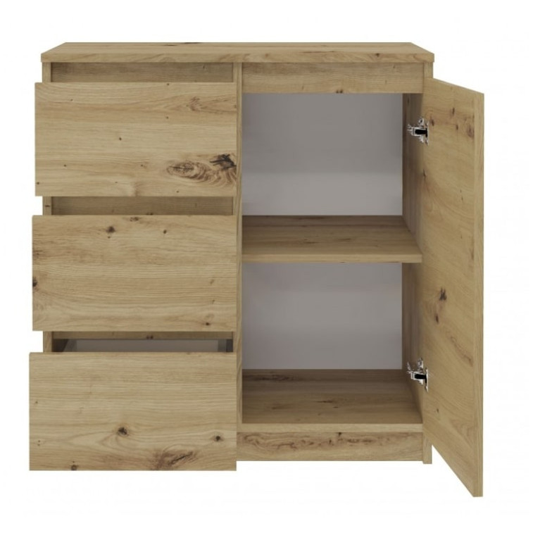 Moderná komoda 1D3S je funkčný kus nábytku, ktorý ozdobí interiér vašej spálne, obývacej izby alebo detskej izby. Univerzálny vzhľad splní očakávania všetkých, ktorí oceňujú spojenie jednoduchosti a elegancie. Vnútro komody sa skladá z políc a zásuviek, ktoré vám pomôžu veci usporiadať.