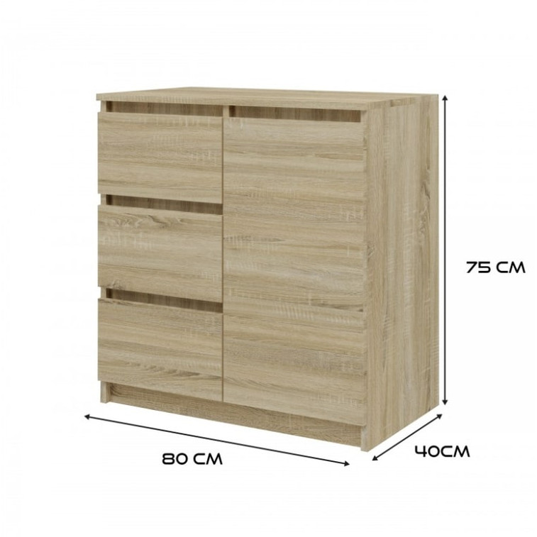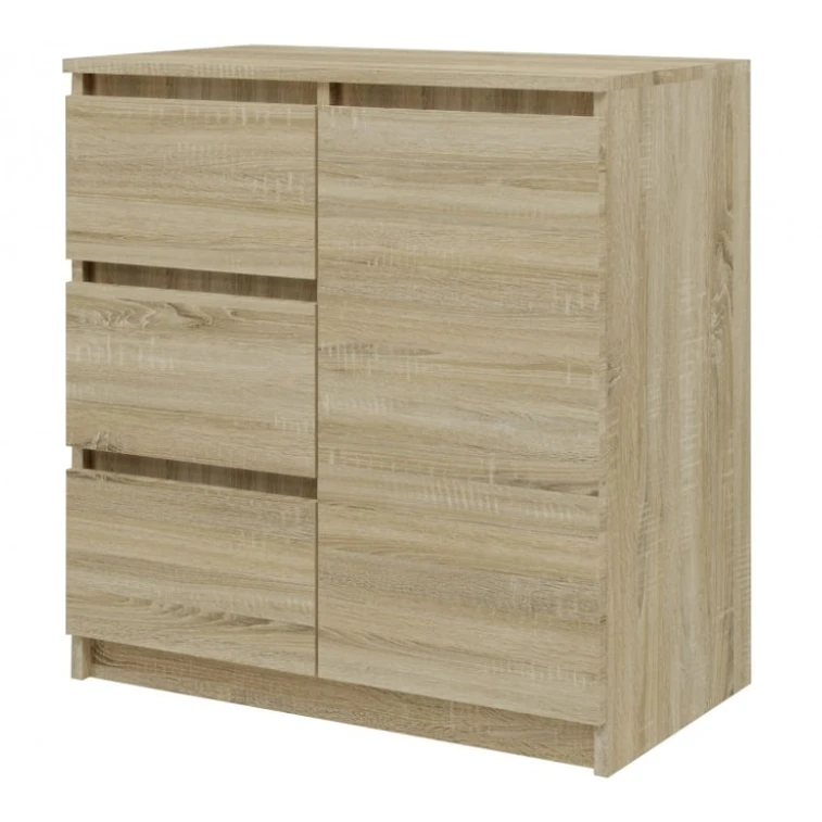 Moderná komoda 1D3S je funkčný kus nábytku, ktorý ozdobí interiér vašej spálne, obývacej izby alebo detskej izby. Univerzálny vzhľad splní očakávania všetkých, ktorí oceňujú spojenie jednoduchosti a elegancie. Vnútro komody sa skladá z políc a zásuviek, ktoré vám pomôžu veci usporiadať.