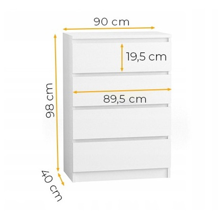 Komoda 90/4 cm je jednoduchá a funkčná. Vyznačuje sa módnou farbou, ktorú určite zladíte k mnohým aranžmánom. Má 4 priestranné zásuvky pre ľahké uloženie oblečenia alebo šikovných doplnkov.