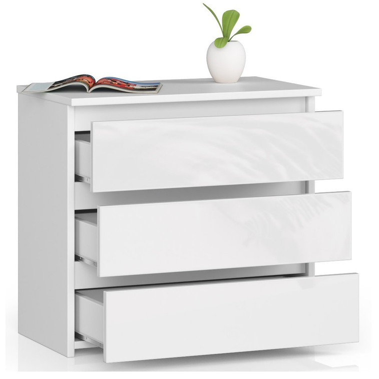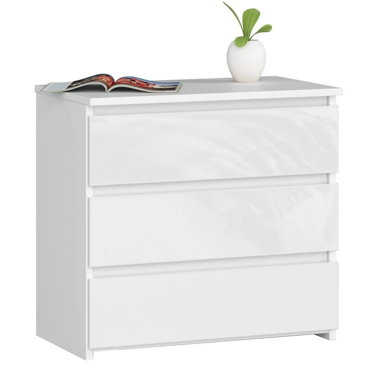 Skvelo sa hodí do minimalistických alebo škandinávskych interiérov. Poslúži doma, ale aj v kancelárii alebo pracovni. Nábytok bol vyrobený z kvalitnej a oderuvzdornej laminovanej dosky o sile 16 mm. Hrany komody zase obsahujú ABS hrany, vďaka čomu sú odolné proti poškodeniu. Komoda sa skladá z troch zásuviek, ktoré sa ľahko a ticho pohybujú vďaka bezchybne fungujúcim kovovým valčekovým vodiacim lištám.