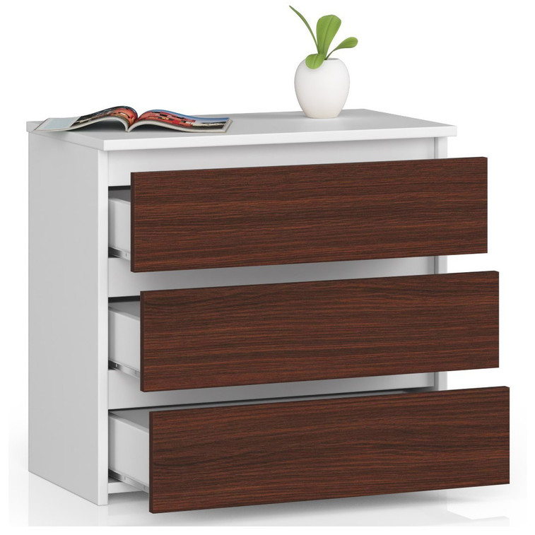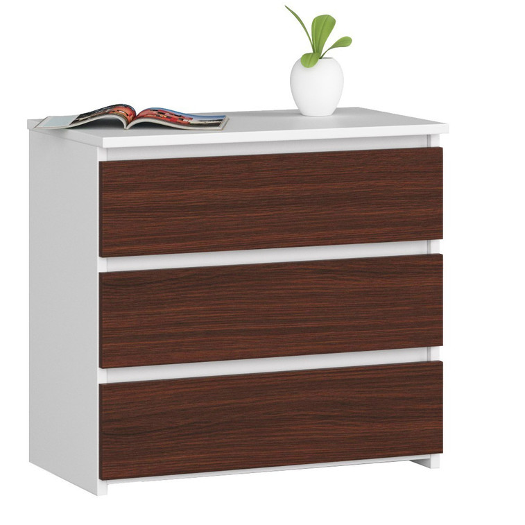 Skvele sa hodí do minimalistických alebo škandinávskych interiérov. Poslúži ako doma, ale aj v kancelárii alebo pracovni. Nábytok bol vyrobený z kvalitnej a oderuvzdornej laminovanej dosky o sile 16 mm. Hrany komody zase obsahujú ABS hrany, vďaka čomu sú odolné proti poškodeniu. Komoda sa skladá z troch zásuviek, ktoré sa ľahko a ticho pohybujú vďaka bezchybne fungujúcim kovovým valčekovým vodiacim lištám.
