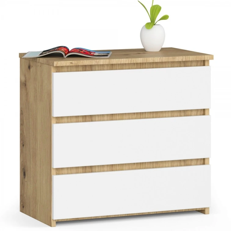Skvele sa hodí do minimalistických alebo škandinávskych interiérov. Poslúži ako doma, ale aj v kancelárii alebo pracovni. Nábytok bol vyrobený z kvalitnej a oderuvzdornej laminovanej dosky o sile 16 mm. Hrany komody zase obsahujú ABS hrany, vďaka čomu sú odolné proti poškodeniu. Komoda sa skladá z troch zásuviek, ktoré sa ľahko a ticho pohybujú vďaka bezchybne fungujúcim kovovým valčekovým vodiacim lištám.