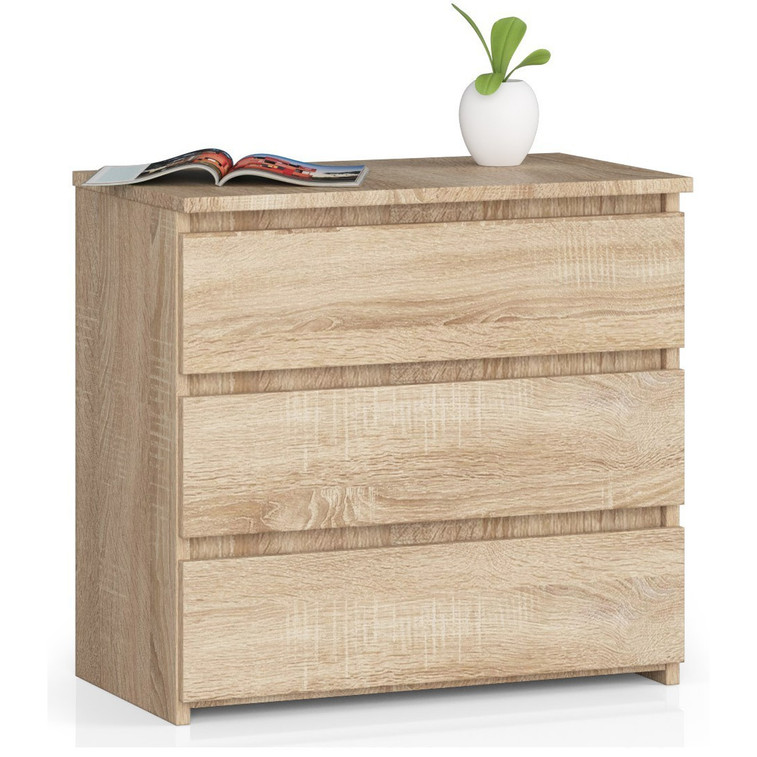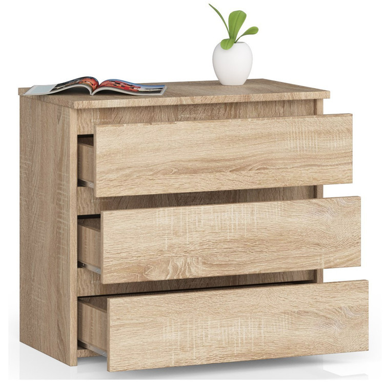 Skvele sa hodí do minimalistických alebo škandinávskych interiérov. Poslúži doma, ale aj v kancelárii alebo pracovni. Nábytok bol vyrobený z kvalitnej a oderuvzdornej laminovanej dosky o sile 16 mm. Hrany komody zabezpečené ABS hranou, vďaka čomu sú odolné proti poškodeniu. Komoda sa skladá z troch zásuviek, ktoré sa ľahko a ticho pohybujú vďaka bezchybne fungujúcim kovovým valčekovým vodiacim lištám.