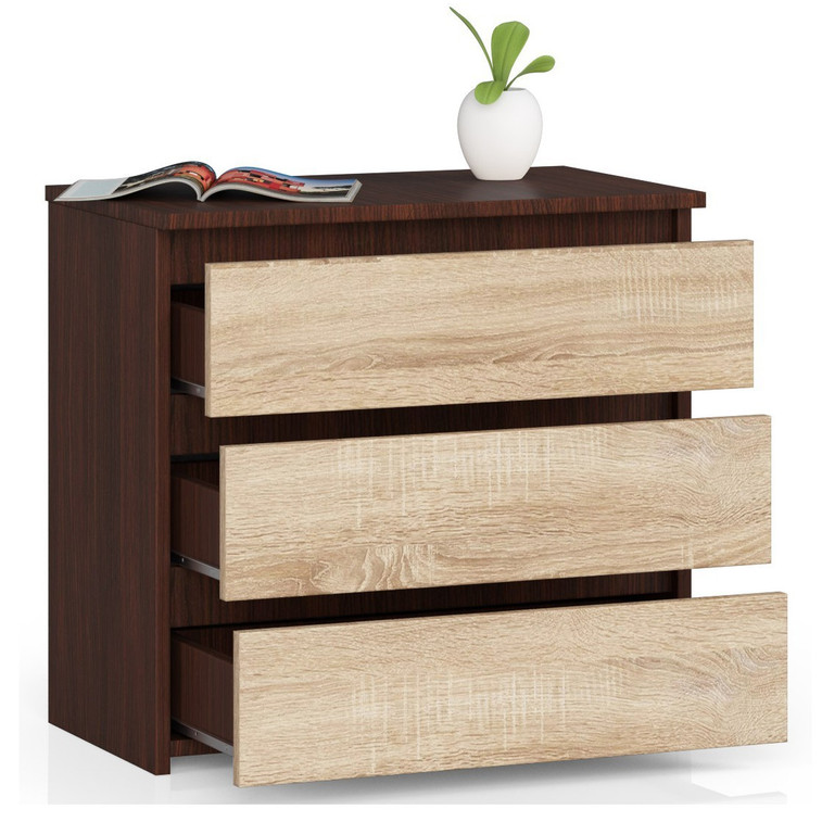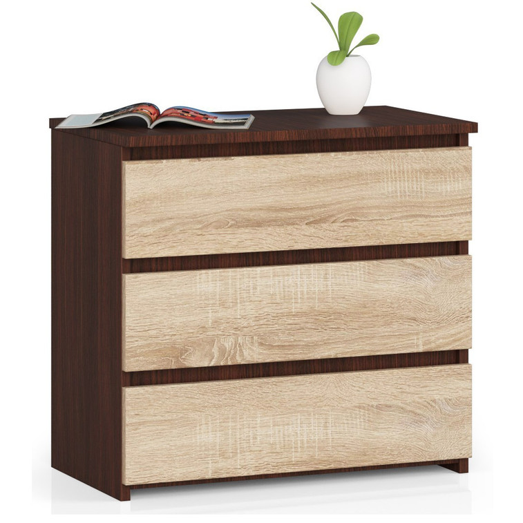 Skvelo sa hodí do minimalistických alebo škandinávskych interiérov. Poslúži doma, ale aj v kancelárii alebo pracovni. Nábytok bol vyrobený z kvalitnej a oderuvzdornej laminovanej dosky o sile 16 mm. Hrany komody zase obsahujú ABS hrany, vďaka čomu sú odolné proti poškodeniu. Komoda sa skladá z troch zásuviek, ktoré sa ľahko a ticho pohybujú vďaka bezchybne fungujúcim kovovým valčekovým vodiacim lištám.