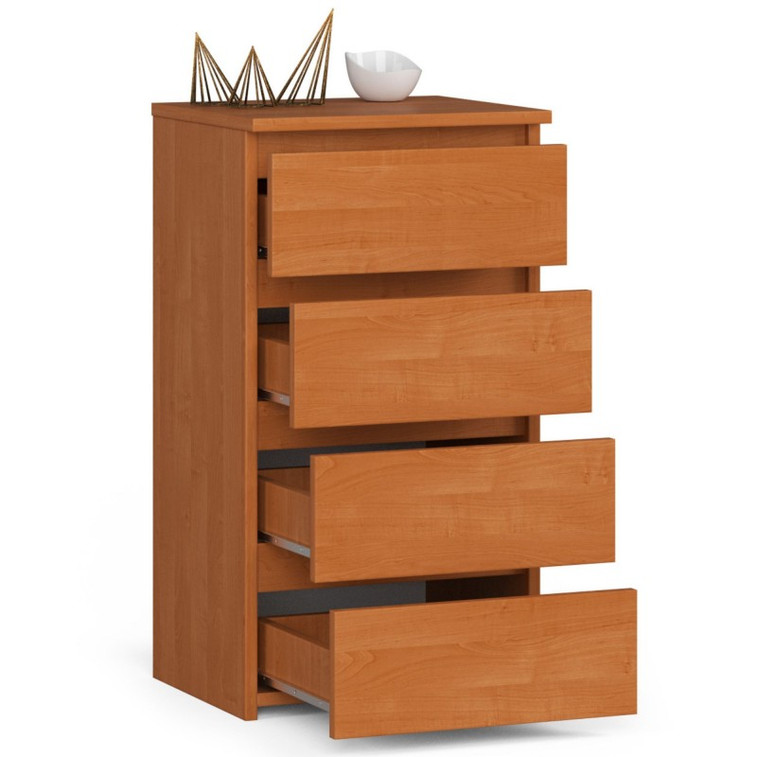 Skvele sa hodí do minimalistických alebo škandinávskych interiérov. Poslúži ako doma, ale aj v kancelárii alebo pracovni. Nábytok bol vyrobený z kvalitnej a oderuvzdornej laminovanej dosky o sile 16 cm. Hrany komody zase obsahujú ABS hrany, vďaka čomu sú odolné proti poškodeniu. Komoda sa skladá zo štyroch zásuviek, ktoré sa ľahko a ticho pohybujú vďaka bezchybne fungujúcim kovovým kolieskovým vodiacim lištám.