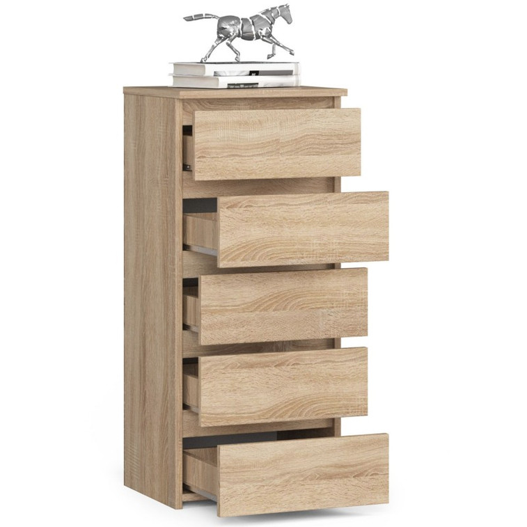 Jednoduchá a moderná komoda. Je vyrobená z pevnej laminovanej dosky, ktorá je odolná proti oderu a poškodeniu. Univerzálny vzhľad splní očakávania každého, kto ocení kombináciu jednoduchosti a elegancie. Bezúchytkové čelá zásuviek zaisťujú pohodlné používanie.