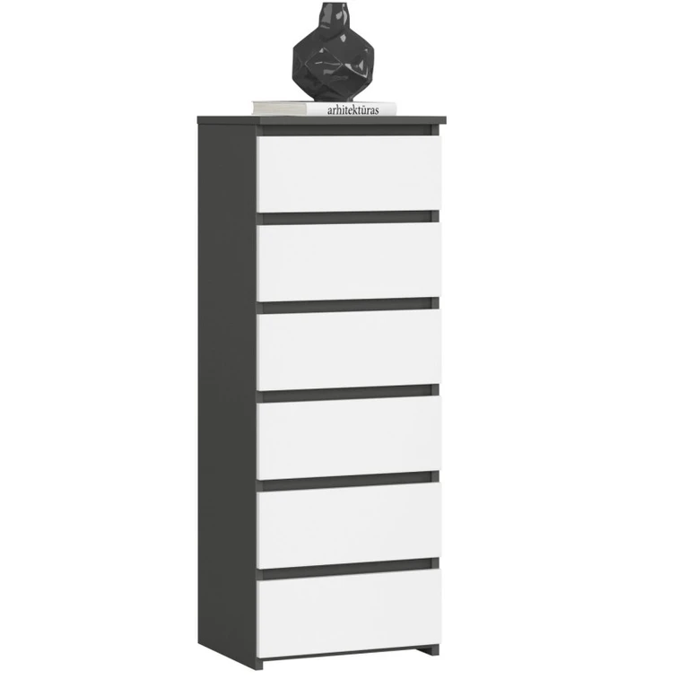 Jednoduchá a moderná komoda. Je vyrobená z pevnej laminovanej dosky, ktorá je odolná proti oderu a poškodeniu. Univerzálny vzhľad splní očakávania každého, kto ocení kombináciu jednoduchosti a elegancie. Bezúchytkové čelá zásuviek zaisťujú pohodlné používanie.