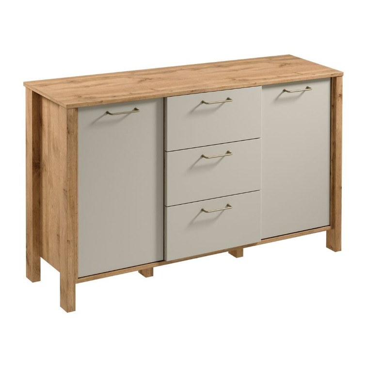 Komoda K2D3S sa skvele hodí na drobnosti a dokumenty. Zásuvky majú funkciu plného výsuvu, čo výrazne uľahčuje prístup k predmetom vo vnútri. Dve priestranné skrine s poličkou ponúkajúcou ďalší úložný priestor. Vysoké nohy umožňujú ľahký prístup. Kovové rukoväte v matne zlatej farbe dodávajú eleganciu. Prírodné farby teplého dekoru dub Wotan na korpuse nábytku v kombinácii s jednofarebnou béžovou alebo zelenou na výber robia kolekciu prirodzene krásnu.