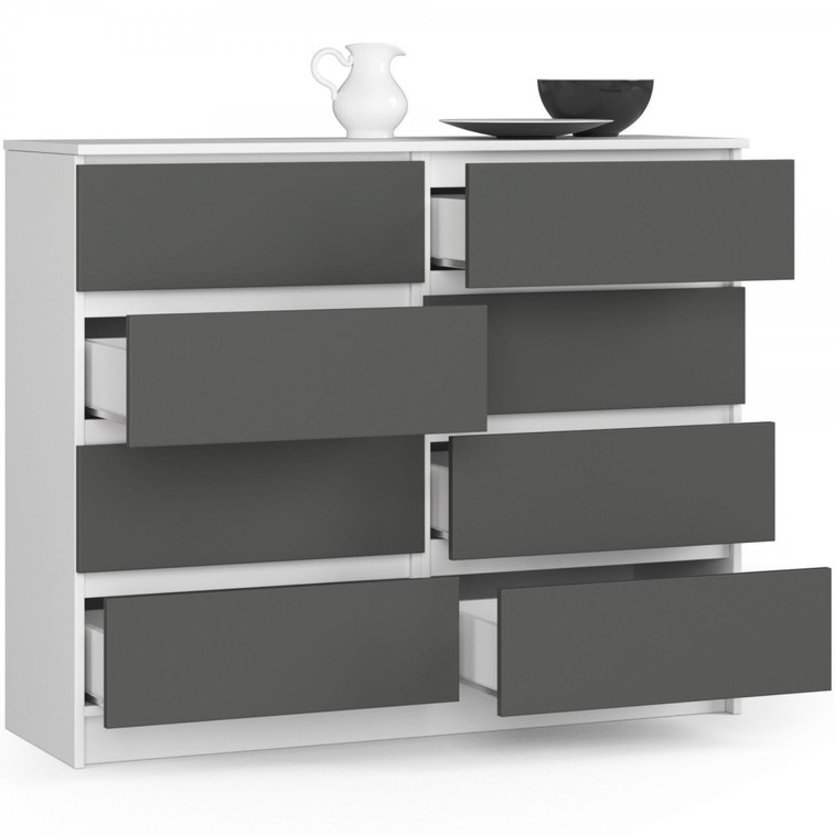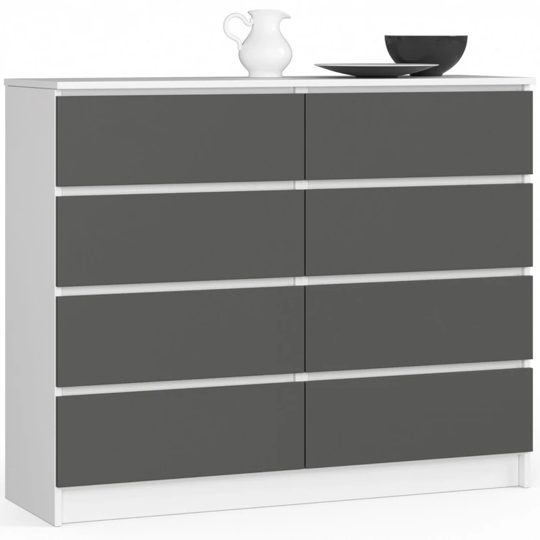 Komoda má moderný vzhľad a vďaka 8 zásuvkám do nej uskladníte veľké množstvo vecí ako je oblečenie, hračky pre deti alebo náradie. Skvele sa hodí do domácnosti, ale svoje miesto nájde aj v pracovných podmienkach.