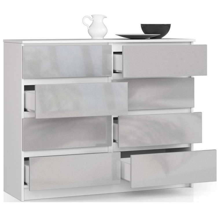 Komoda má moderný vzhľad a vďaka 8 zásuvkám do nej uskladníte veľké množstvo vecí ako je oblečenie, hračky pre deti alebo náradie. Skvele pasuje do domácnosti, ale svoje miesto nájde aj v pracovných podmienkach.