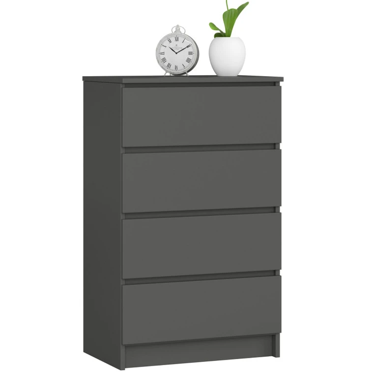 Jednoduchá a moderná komoda. Je vyrobená z pevnej laminovanej dosky, ktorá je odolná proti oderu a poškodeniu. Univerzálny vzhľad splní očakávania každého, kto ocení kombináciu jednoduchosti a elegancie. Bezúchytkové čelá zásuviek zaisťujú pohodlné používanie.