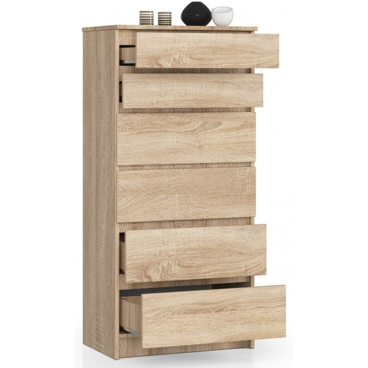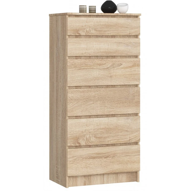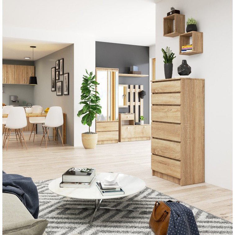 Jednoduchá a moderná komoda K60 6SZ. Je vyrobená z pevnej laminovanej dosky, ktorá je odolná proti oderu a poškodeniu.Univerzálny vzhľad splní očakávania každého, kto ocenia kombináciu jednoduchosti a elegancie.Bezúchytkové čelá zásuviek zaisťujú pohodlné používanie.