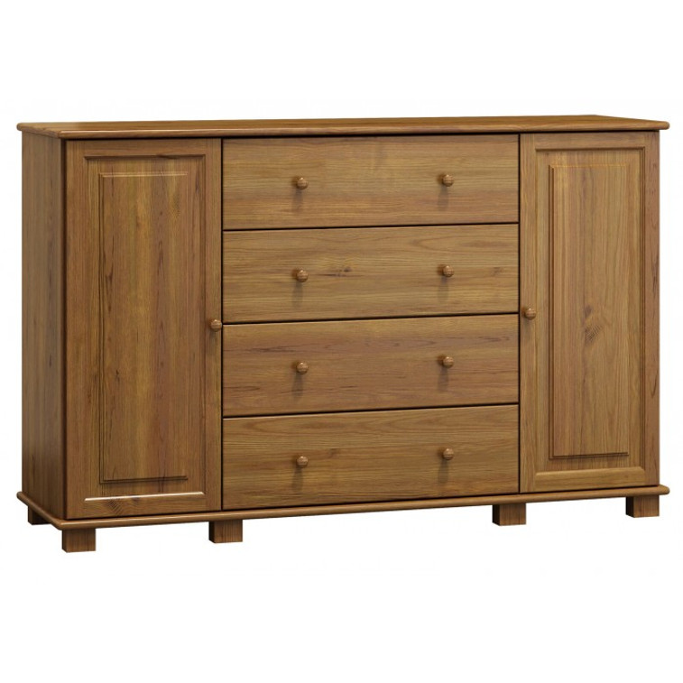 Komoda z masívu je štýlová komoda vyrobená z veľmi kvalitného borovicového masívu, ktorý je ošetrený transparentným lakom. Tým je nábytok chránený pred drobnými povrchovými poškodeniami. Táto kombinovaná komoda má k dispozícii štyri veľké zásuvky a skrinky. Skvele sa hodí do spálne, detskej izby, obývacej izby, predsiene či haly.