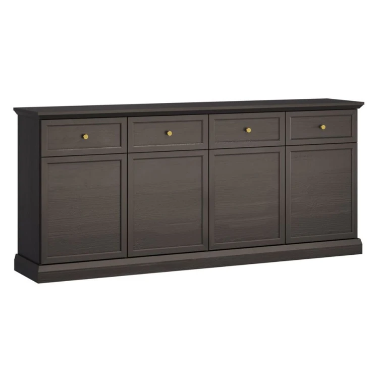 Praktická komoda s štyrmi priestrannými zásuvkami a štyrmi skrinkami. Čiernohnedý alebo biely dekor s hlbokými prírodnými pórmi dreva má rôzne stupne lesku a pôsobí mimoriadne dynamicky a veľmi rozmanito. Kolekcia Lucca vám umožňuje voľne miešať klasický a moderný štýl.