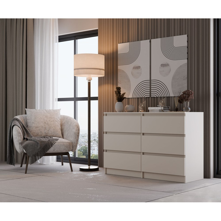 Jednoduchá a moderná komoda. Je vyrobená z pevnej laminovanej dosky, ktorá je odolná proti oderu a poškodeniu. Univerzálny vzhľad splní očakávania každého, kto ocenia kombináciu jednoduchosti a elegancie. Bezúchytkové čelá zásuviek zaisťujú pohodlné používanie.