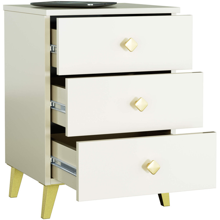 Moderná komoda s 3 priestrannými zásuvkami. Vysoké plastové nohy umožňujú ľahký prístup pre vysávač.