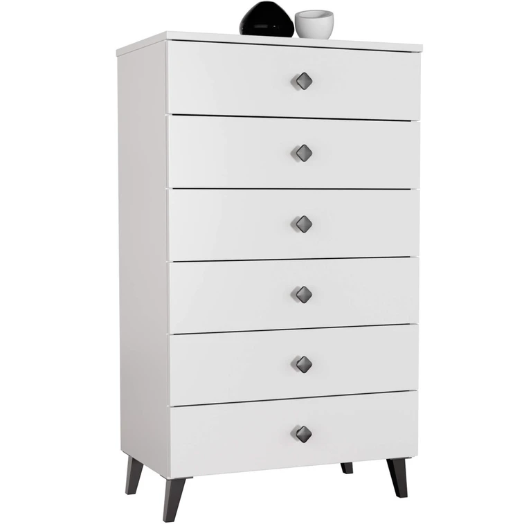 Moderná komoda s 6 priestrannými zásuvkami. Vysoké plastové nohy umožňujú ľahký prístup pre vysávač.