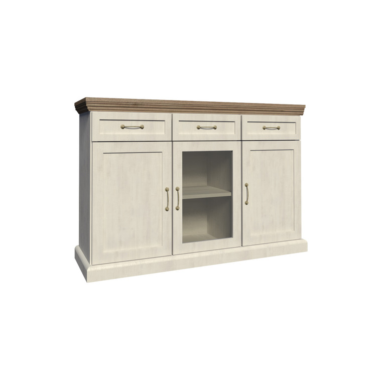 Komoda Royal K1S je vytvorená v anglickom štýle. Zostava nábytku vnesie do Vášho domova štýl a eleganciu. Nábytkom si môžete zariadiť celý svoj domov - jedáleň, spálňu, obývaciu izbu, kuchyňu alebo predsieň. Nábytok je vyrobený z veľmi kvalitného lamina v kombinácii s MDF vo farebnom prevedení Borovica nordická (korpus a predné plochy nábytku) s Dubom divokým (horné plochy nábytku). Úchytky sú kovové. Komoda je veľmi praktická vďaka 3. skrinkám, z toho jednou presklenou a zároveň 3. zásuvkami. Tento typ komody teda dáva možnosť uschovať predmety aj vystaviť obľúbené predmety. Dodávame v demontovanom stave.