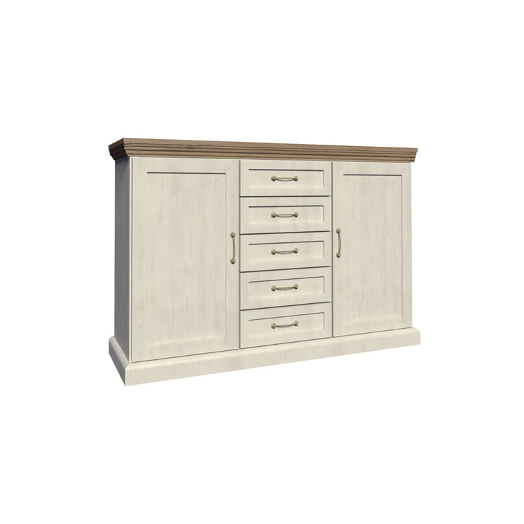 Komoda Royal K2D je vytvorená v anglickom štýle. Zostava nábytku vnesie do Vášho domova štýl a eleganciu. Nábytkom si môžete zariadiť celý svoj domov - jedáleň, spálňu, obývaciu izbu, kuchyňu alebo predsieň. Nábytok je vyrobený z veľmi kvalitného lamina v kombinácii s MDF vo farebnom prevedení Borovica nordická (korpus a predné plochy nábytku) s Dubom divokým (horné plochy nábytku). Úchytky sú kovové. Komoda je veľmi praktická vďaka 2. skrinkám a 5. zásuvkám. Tento typ komody teda dáva možnosť veľkého úložného priestoru. Dodávame v demontovanom stave.