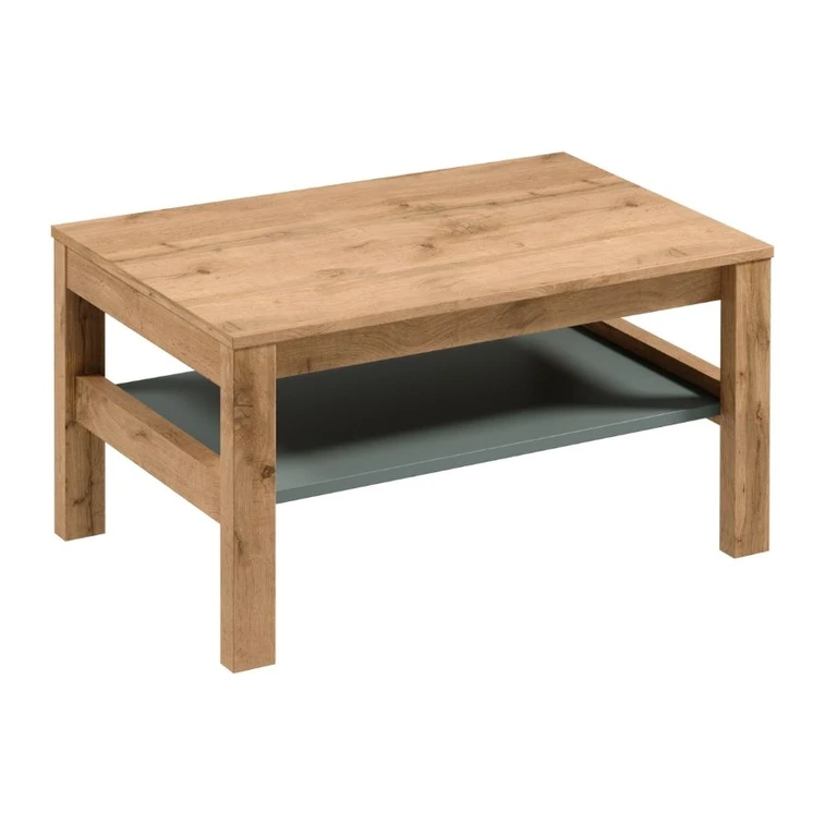 Konferenčný stolík s policou na knihy alebo časopisy. Skvelý doplnok k celej kolekcii Indigo. Prírodné farby teplého dekoru dub Wotan na korpuse nábytku v kombinácii s jednofarebnou béžovou alebo zelenou na výber robia kolekciu prirodzene krásnu.