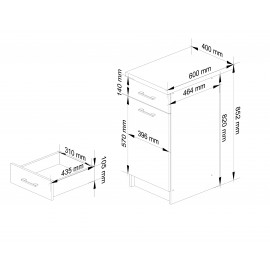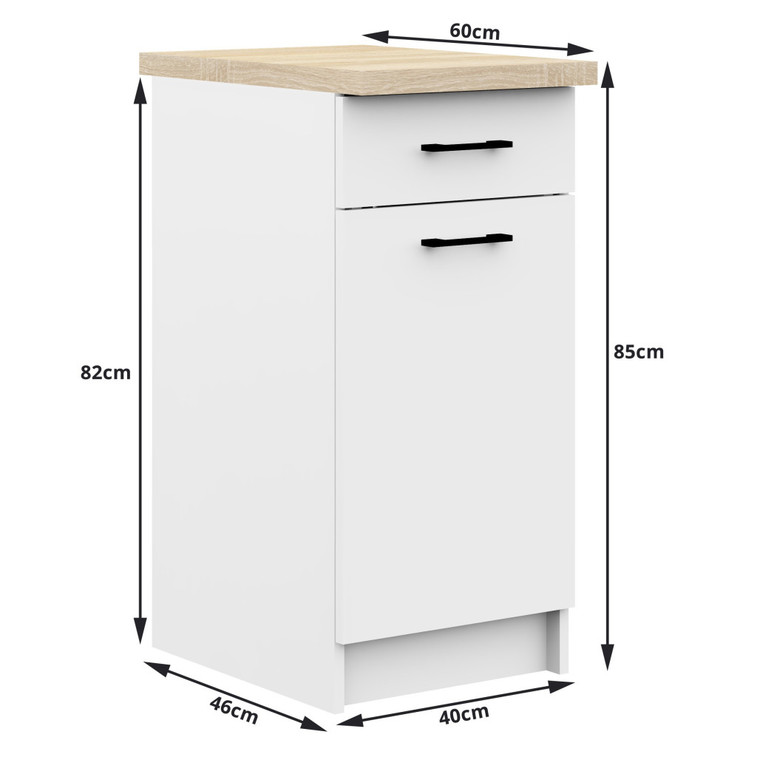 Skrinka S40 1D 1S má priestrannú zásuvku na kuchynské náčinie, vo vnútri dvierok sú police, do ktorých sa zmestí čo najviac doplnkov do kuchyne.