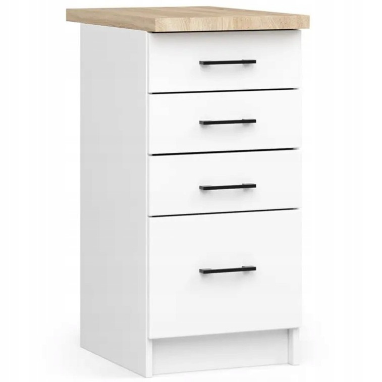 Kuchynská skrinka navrhnutá v módnej bielej farbe, vybavená dubovou doskou a modernými čiernymi úchytmi zaisťujúcimi dlhé a bezproblémové používanie, je zaujímavou ponukou venovanou všetkým, ktorí chcú vytvoriť nadčasový funkčný interiér. Nábytok určený pre modulárnu stavbu kuchyne sa vyznačuje predovšetkým moderným dizajnom, ale aj vynikajúcou kvalitou. Výrobok je vyrobený z odolnej a oteruvzdornej laminovanej dosky, ktorá zaručuje jeho dlhú životnosť. Praktická kuchynská skrinka v dvoch najmódnejších farbách, ľahko sa udržuje v čistote a navyše dostupná za skvelú cenu.
