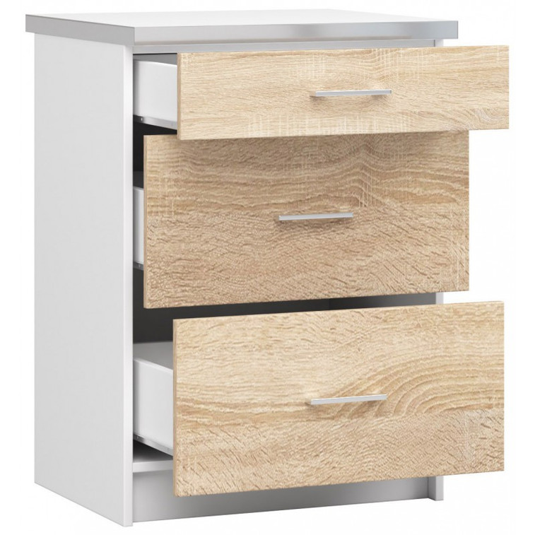 Skrinka z akčnej zostavy LIMA je skvelým riešením do každej funkčne a moderne zariadenej kuchyne. Predná úprava vo farebnom dekore Dub Sonoma z prírodnej štruktúry dreva sa skvele hodí k bielemu korpusu. Nábytok sa skladá z troch zásuviek - dvoch veľkých a jednej menšej. Skrinka vám umožní uložiť príbory aj ďalšie drobné kuchynské vychytávky. Voľnosť použitia a ľahké čistenie sú ďalšími výhodami predloženého návrhu.
