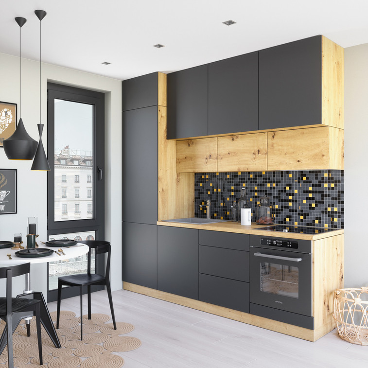 Moderná kuchynská zostava VINTO 2,4 m v odtieni dub artisan/sivá. Hotová zostava, ktorá vám pomôže zariadiť malý kuchynský priestor.