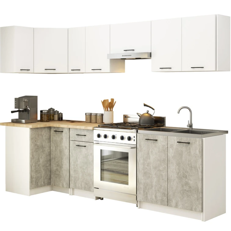 Jednoduchý kuchynský nábytok Olivia je ponuka určená ľuďom, ktorí sú vo fáze zariaďovania svojej malej kuchyne. Systémové riešenia sú mimoriadne funkčné a dobre fungujú v malých miestnostiach. Predstavujeme vám systém kuchynských skriniek s doskou, ktorá kombinuje módny odtieň dub sonoma a klasicky krásnu, nesmrteľnú bielu a betón.