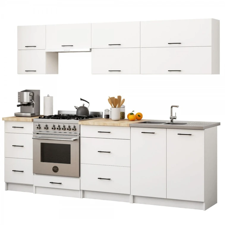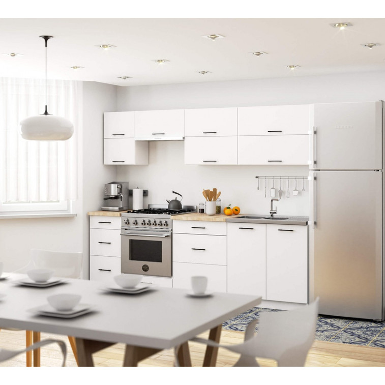 Zostava kuchynského nábytku je vyrobená z laminovanej dosky hrúbky 16 mm. Celok sa vyznačuje pevnou konštrukciou, ktorá je zárukou životnosti a odolnosti proti poškodeniu prezentovanej zostavy. Prvky v ňom obsiahnuté je možné medzi sebou ľubovoľne kombinovať a personalizovať tak nábytok s prihliadnutím na individuálne potreby.