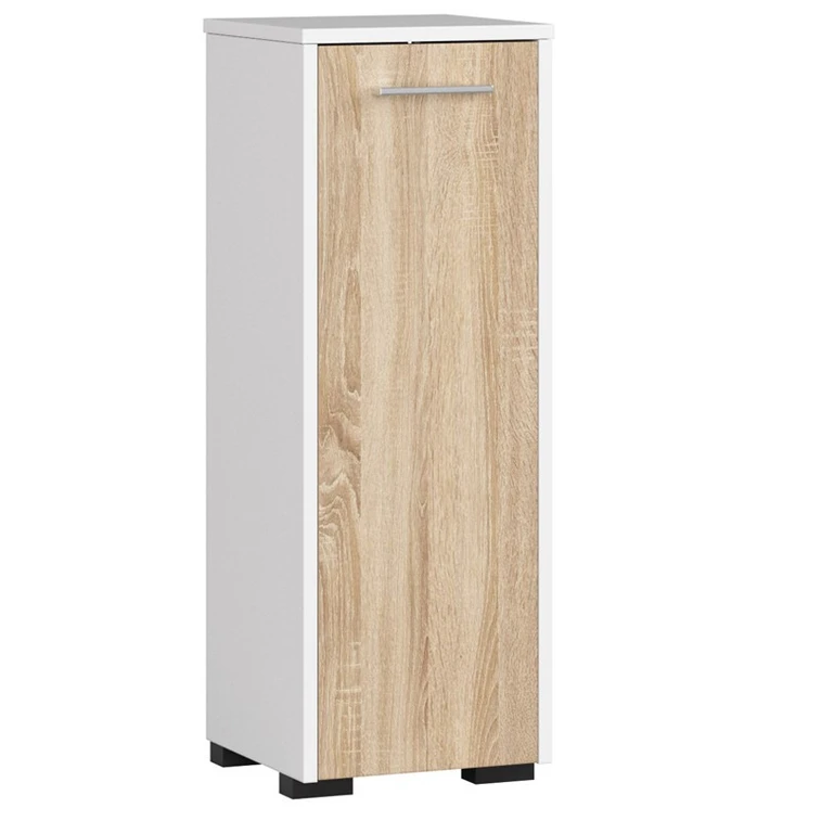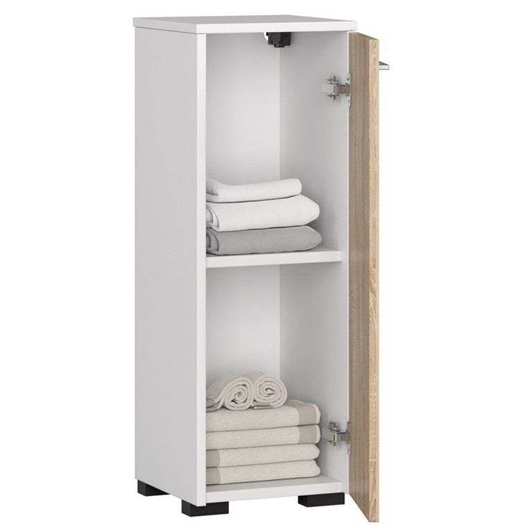 Kúpeľňová skrinka je vo svojej jednoduchosti veľmi praktický a elegantný kus nábytku. Vďaka malým rozmerom nájde uplatnenie aj v malých kúpeľniach. Do priestranných políc skrine sa zmestia uteráky, čistiace prostriedky alebo náhradné mydlá či kozmetika. Skrinka sa dá využiť aj pre kúpeľňovú váhu, zariadenie na úpravu vlasov alebo masážny prístroj na nohy. Horná časť skrinky, umiestnená v pohodlnej výške, poslúži na každodennú kozmetiku a parfumy alebo dekoratívne zrkadlo na líčenie. Skriňa je vyrobená z laminovanej dosky, ktorá je odolná proti vlhkosti a oderu.