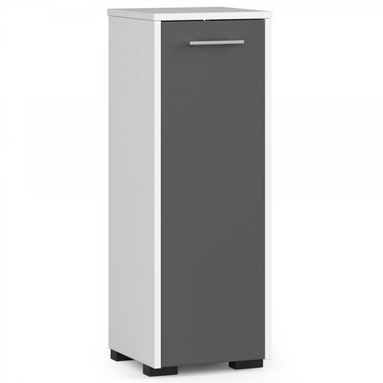 Kúpeľňová skrinka je vo svojej jednoduchosti veľmi praktický a elegantný kus nábytku. Vďaka malým rozmerom nájde uplatnenie aj v malých kúpeľniach. Do priestranných políc skrine sa zmestia uteráky, čistiace prostriedky alebo náhradné mydlá či kozmetika. Skrinka sa dá využiť aj pre kúpeľňovú váhu, zariadenie na úpravu vlasov alebo masážny prístroj na nohy. Horná časť skrinky, umiestnená v pohodlnej výške, poslúži na každodennú kozmetiku a parfumy alebo dekoratívne zrkadlo na líčenie. Skriňa je vyrobená z laminovanej dosky, ktorá je odolná proti vlhkosti a oderu.