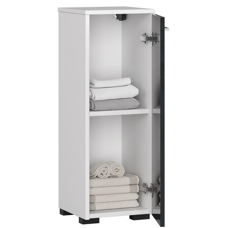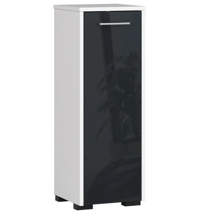 Kúpeľňová skrinka je vo svojej jednoduchosti veľmi praktický a elegantný kus nábytku. Vďaka malým rozmerom nájde uplatnenie aj v malých kúpeľniach. Do priestranných políc skrine sa zmestia uteráky, čistiace prostriedky alebo náhradné mydlá či kozmetika. Skrinka sa dá využiť aj pre kúpeľňovú váhu, zariadenie na úpravu vlasov alebo masážny prístroj na nohy. Horná časť skrinky, umiestnená v pohodlnej výške, poslúži na každodennú kozmetiku a parfumy alebo dekoratívne zrkadlo na líčenie. Skriňa je vyrobená z laminovanej dosky, ktorá je odolná proti vlhkosti a oderu.