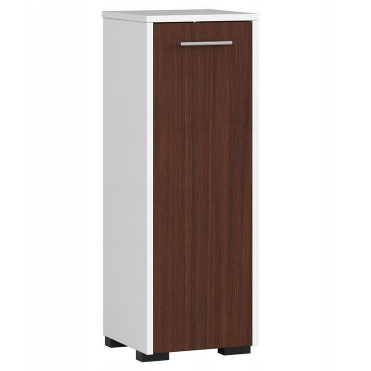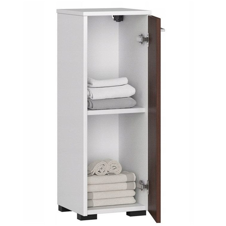 Kúpeľňová skrinka je vo svojej jednoduchosti veľmi praktický a elegantný kus nábytku. Vďaka malým rozmerom nájde uplatnenie aj v malých kúpeľniach. Do priestranných políc skrine sa zmestia uteráky, čistiace prostriedky alebo náhradné mydlá či kozmetika. Skrinka sa dá využiť aj pre kúpeľňovú váhu, zariadenie na úpravu vlasov alebo masážny prístroj na nohy. Horná časť skrinky, umiestnená v pohodlnej výške, poslúži na každodennú kozmetiku a parfumy alebo dekoratívne zrkadlo na líčenie. Skriňa je vyrobená z laminovanej dosky, ktorá je odolná proti vlhkosti a oderu.