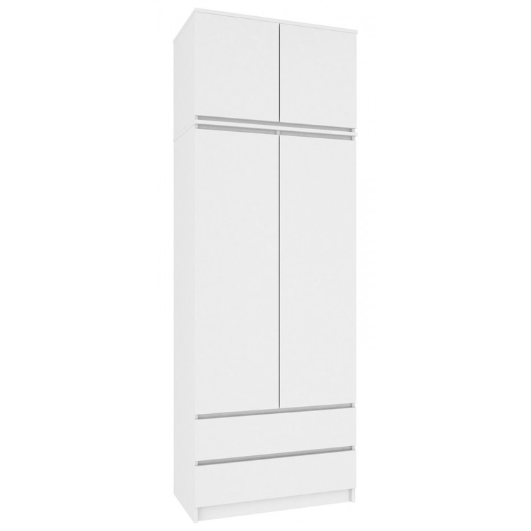 Nadstavba na šatníkovú skriňu S90 so zásuvkami je perfektným riešením pre ľudí, ktorí chcú zvýšiť funkčnosť existujúceho kusu nábytku. Šatníková skriňa so zásuvkami, priestorom pre ramienka a policou je už pomerne priestranná. V kombinácii s prístavbou – vytvorením ďalšieho priestoru – sa však stane ešte funkčnejšou. V nadstavbe umiestnenej na skrini môžete uložiť menej často používané oblečenie, posteľnú bielizeň alebo do nej po zimnej sezóne presťahovať teplé oblečenie a získať tak priestor pre ľahšie oblečenie. Nadstavec skrine je vyrobený z odolnej a oderuvzdornej laminovanej dosky. Okraje nástavca sú starostlivo zakončené odolnou ABS dyhou. Šatníková skriňa s nadstavbou vyzerá veľmi efektne a môže stáť nielen v spálni alebo na chodbe, ale aj na reprezentatívnejšom mieste domu, ktorým je obývacia izba. Tento kus nábytku bude dobre fungovať v bytoch s malou plochou, kde je veľmi dôležité racionálne využitie priestoru.