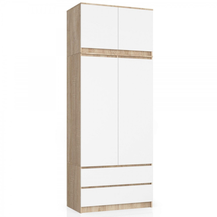 Nadstavba na šatníkovú skriňu S90 so zásuvkami je perfektným riešením pre ľudí, ktorí chcú zvýšiť funkčnosť existujúceho kusu nábytku. Šatníková skriňa so zásuvkami, priestorom pre ramienka a policou je už pomerne priestranná. V kombinácii s prístavbou – vytvorením ďalšieho priestoru – sa však stane ešte funkčnejšou. V nadstavbe umiestnenej na skrini môžete uložiť menej často používané oblečenie, posteľnú bielizeň alebo do nej po zimnej sezóne presťahovať teplé oblečenie a získať tak priestor pre ľahšie oblečenie. Nadstavec skrine je vyrobený z odolnej a oderuvzdornej laminovanej dosky. Okraje nástavca sú starostlivo zakončené odolnou ABS dyhou. Šatníková skriňa s nadstavbou vyzerá veľmi efektne a môže stáť nielen v spálni alebo na chodbe, ale aj na reprezentatívnejšom mieste domu, ktorým je obývacia izba. Tento kus nábytku bude dobre fungovať v bytoch s malou plochou, kde je veľmi dôležité racionálne využitie priestoru.