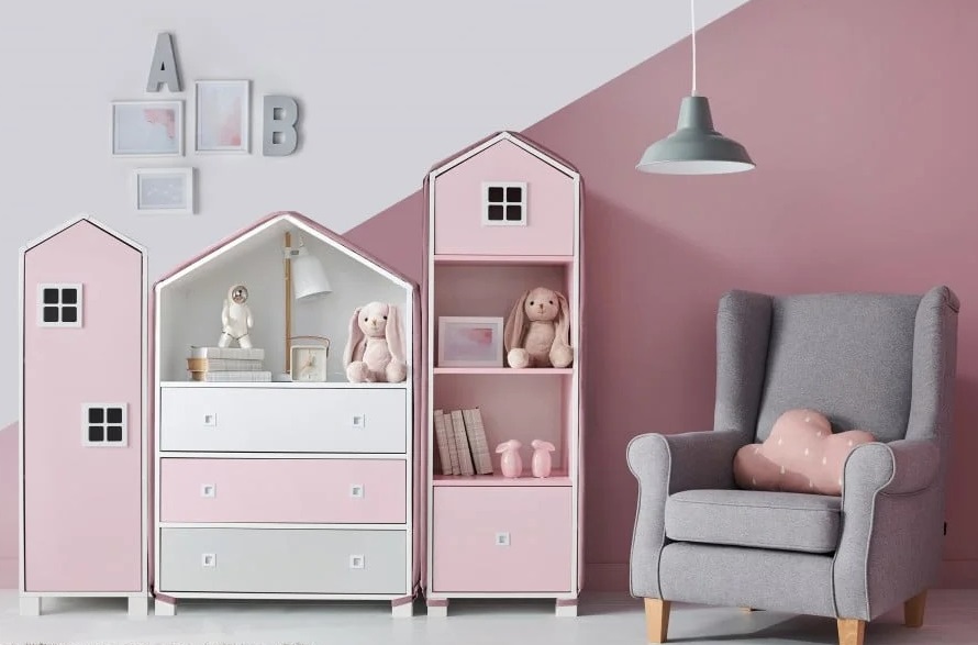 Dievčenské skrine môžu mať podobu domčeka v ružovej farbe. Taká skriňa môže byť vyššia, čiastočne zatvorené dvierkami, čiastočne s otvorenými policami. Vo dvierkach sú potom vyrezané okienka, takže domček pôsobí viac reálne. Ďalší ružový domček so sedlovou strechou, teda „domčeková skriňa“, môže byť s plnými vysokými dvierkami a jedným hlavným okienkom. Stačí mať dva domy vedľa seba a razom vytvoríte pomyselnú dedinku.