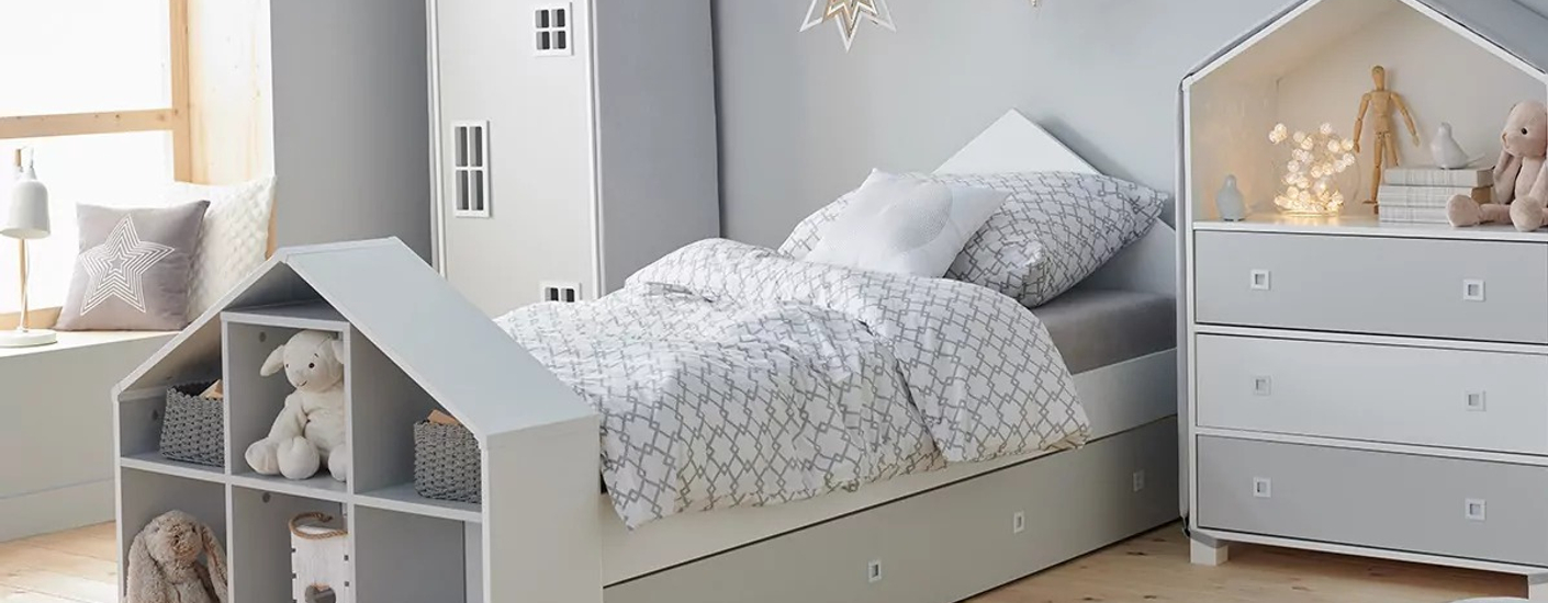 K dostaniu sú aj otvorené regály v tvare domčeka, ktoré výborne dotvoria ráz izby. Čo tak kúpiť ho v bielo-sivom prevedení? Tento regál sa hodí pre chlapcov aj dievčatá.