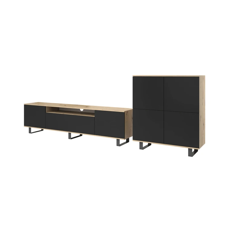 Obývacia stena Logan je príkladom modernej zostavy nábytku. Stena je vyrobená z laminovanej dosky so štruktúrou dreva, ktorá vyzerá úžasne v každej miestnosti. Jednotlivé časti zo zostavy je možné umiestniť samostatne presne tak, aby sa stena prispôsobila Vašej miestnosti a stala sa funkčnou. Otváranie v systéme "PUSH TO OPEN" - komoda je vybavená mechanizmom, ktorý po ľahkom stlačení dvierka otvorí, vysoká kvalita. Komodu aj TV stolík je možné postaviť aj bez kovovej podnože, alebo zavesiť na stenu.