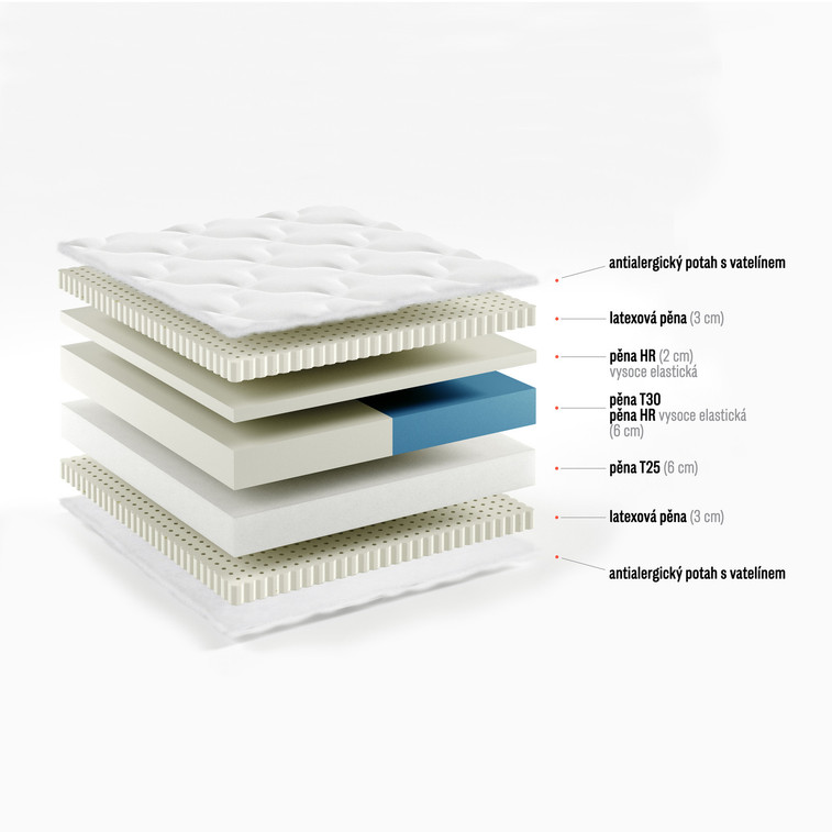 Pena: Je vyrobená z vysoko kvalitnej polyuretánovej peny T25 so zvýšenou pružnosťou a pevnosťou. T30 profilovanej peny s masážnymi vlastnosťami. HR peny, ktorá vyniká tvarovou stálosťou a vysokou elasticitou.