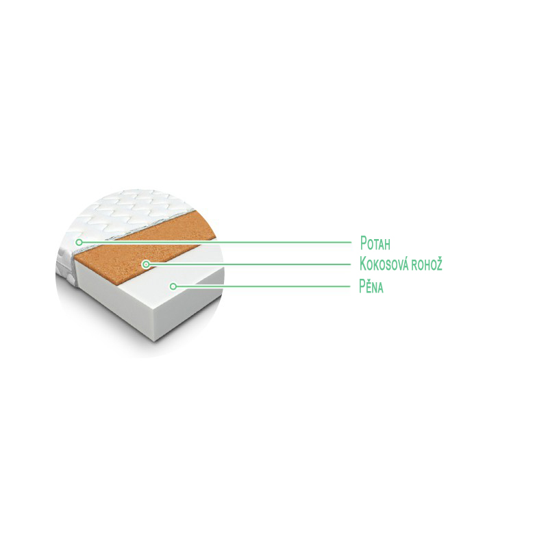 Veľmi kvalitný matrac tvorený z 8 cm kvalitnej tvrdenej peny T25 s kokosovou vrstvou. Kokosová vrstva zaručuje antibakteriálnosť matraca. Matrac je tak veľmi vhodný pre alergikov.