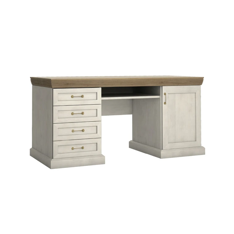 Písací stôl Royal je vytvorený v anglickom štýle. Zostava nábytku vnesie do Vášho domova štýl a eleganciu. Nábytkom si môžete zariadiť celý svoj domov - jedáleň, spálňu, obývaciu izbu, kuchyňu alebo predsieň. Nábytok je vyrobený z veľmi kvalitného lamina v kombinácii s MDF vo farebnom prevedení Borovica nordická (korpus a predné plochy nábytku) s Dubom divokým (horné plochy nábytku). Úchytky sú kovové. Písací stôl zaisťuje výnimočnú funkčnosť v kancelárskom priestore. Tento model je vybavený štyrmi hlbokými zásuvkami a jednou uzavretou časťou. Dodávame v demontovanom stave.