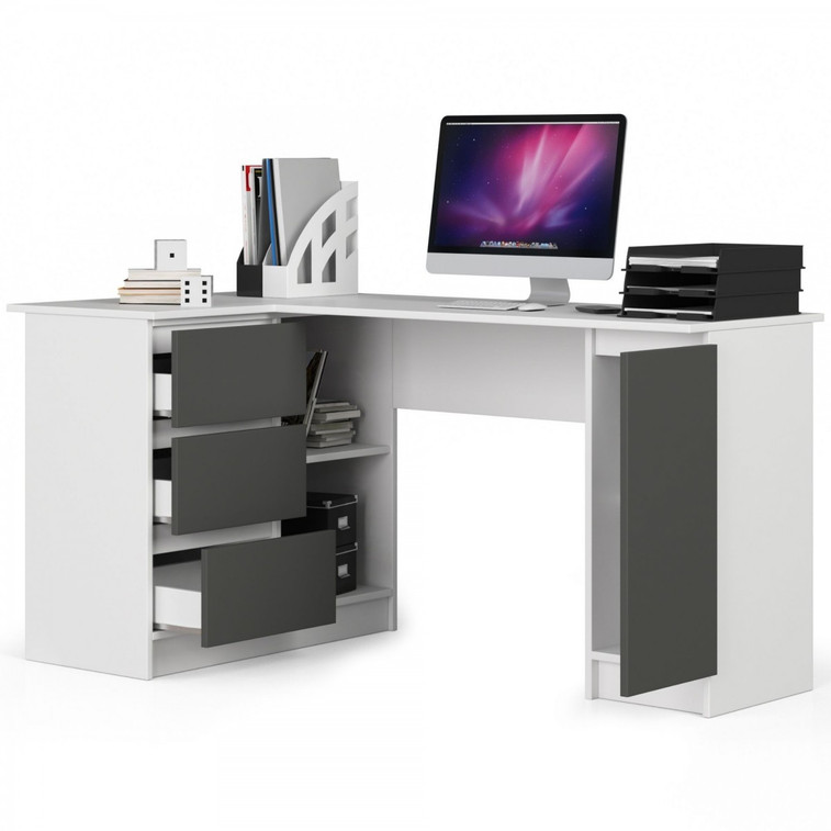 Krásny a funkčný rohový počítačový stôl so skrinkou a zásuvkami je módny kus nábytku v modernom farebnom prevedení, ktorý si naši zákazníci s nadšením vyberajú. Rohový stôl dokonale využíva priestor a zároveň poskytuje úplne pohodlné miesto na prácu. Je vybavená dlhou doskou, rovnako ako početnými skrinkami a zásuvkami, do ktorých môžete uložiť drobné predmety potrebné na pracovisku. Nábytok je vyrobený z laminovanej dosky s hrúbkou 16 mm, ktorá je vysoko odolná proti oderu. Pohľadové hrany sú pokryté ABS hranou so zvýšenou odolnosťou proti poškodeniu.