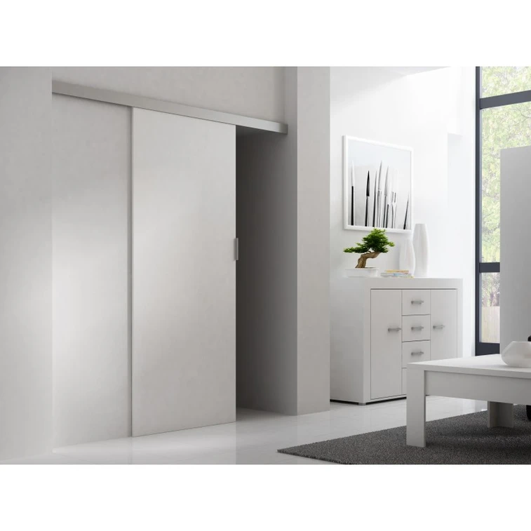 Posuvné dvere Greg 86 cm. Pokiaľ chcete ideálne využiť priestor vášho bytu, posuvné dvere sú ideálnym riešením. Môžete ich využiť ako oddelenie dvoch miestností, alebo ako dvere do skrine či šatne. Možnosť namontovať na pravú aj ľavú stranu. Dvere majú jedno pevné hliníkové madlo.